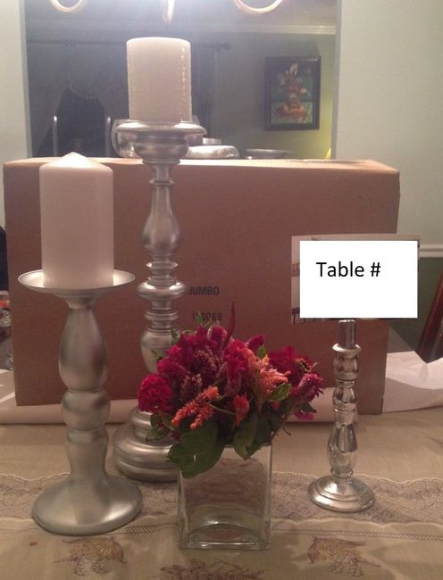 4223 days agoI just made my first centerpieces let me know your honest thoughts! Each table's arrangements will look different using an array of metallic/mercury glass vases and tall pillar candles. I purchased most items from thrift stores and spray painted them...
