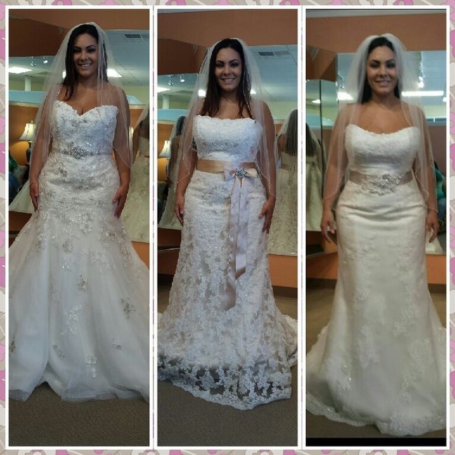 I'm torn because I like all 3!! They all feel amazing on!! My mom and MOH likes the 1st and 2nd one too. What do you guys think?? Thanks!! ETA: all 3 are Maggie Sottero