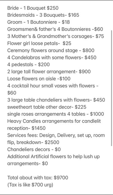 Our wedding will be in Houston TX and we have talked to 3 different florists. I couldn’t believe how expensive florals could be! Anyways, we really like a floral designer, her designs are phenomenal, and she understands our vision effortlessly. Here...