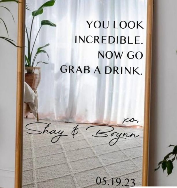 I have found the decals to put on the guests restroom mirrors. Looking for suggestions on what to put on the mirror in the bridal suite. They have full length mirrors and I thought it would be a nice touch. Pic of what we are putting in guest...