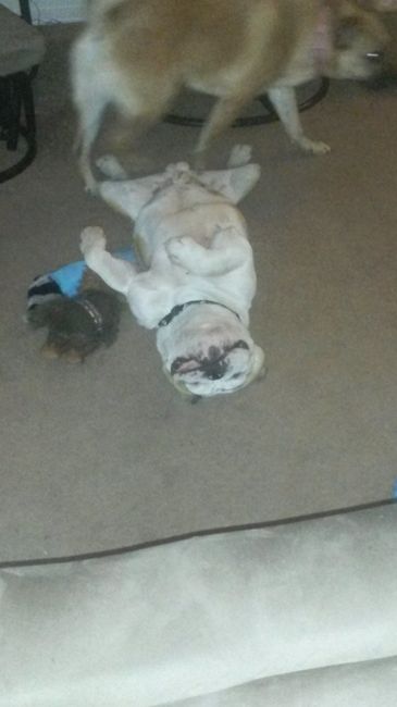 So our English Bulldog puppy (11 months) broke out in hives again today. Last time our vet was open and got him in right away which was good because his poor face was swelling. Today wasn't as bad, but he had huge hives under his neck and his face...