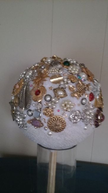 It isn't completely finished. I am still adding small pieces to fill in the gaps. I wanted a vintage feel to it so I attached a doiley to the bottom of the styrofoam ball. I wanted it to be different and for the lace under the brooches to be...