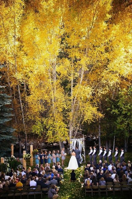 We are getting married in the mountains in October when the colors are changing (fingers crossed). The ceremony will be outside weather permitting, and the reception in a banquet hall with panoramic windows. It is a mountain resort but not...