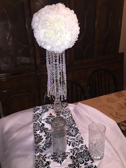 It's finally becoming a reality! I was so indecisive at first with what I wanted to do with my centerpieces but I'm happy I made up my mind. I will also have 4 vases with led lights/ waterbeads and a table number surrounding the tall centerpiece....