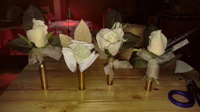 I'm making the boutonnieres for the wedding. Our theme is rustic/vintage and everyone standing up in the wedding, target shots with the FH. The brass is a shell of a 7mm shotgun.
