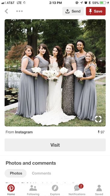 My bridesmaids are wearing a dusty blue convertible tulle dress, (7) and I’m thinking of having my MOH in a different beaded dress! Thoughts? I’m thinking a charcoal color. The men are wearing navy suits and all of our flowers and decor are white...