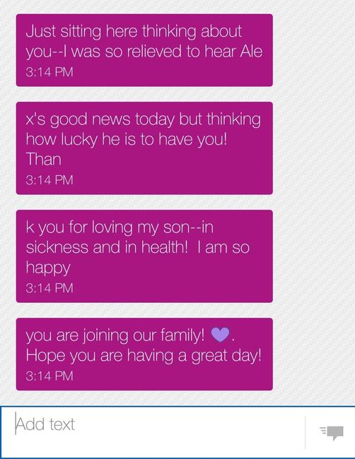 My FMIL sent me a super sweet text message yesterday and made my day! FH has been having some health problems recently and he had to have a spinal tap last week to rule out multiple sclerosis as a possibility. He finally got the results back...