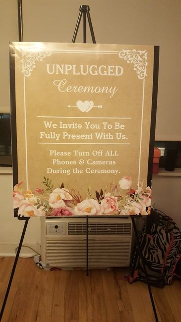 I just received my "Unplugged Ceremony" sign from Zazzle. It came rolled up in a tube. I just glued it to a poster board that I got from the 99 cent store, put it up on the stand and ta da! We are using this as well as having our officiant make an...