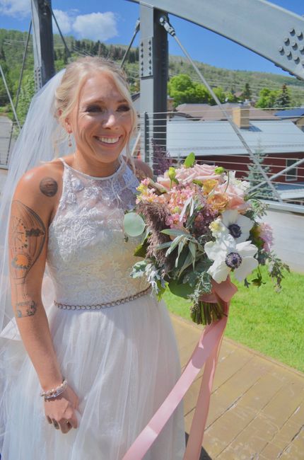 Our wedding was very informal. We got married on the upper balcony of the Kennedy Center in Washington DC. My daughter’s were my maids of honor, and they chose their own dresses within a pallet. What made my bouquet so special is that my youngest...