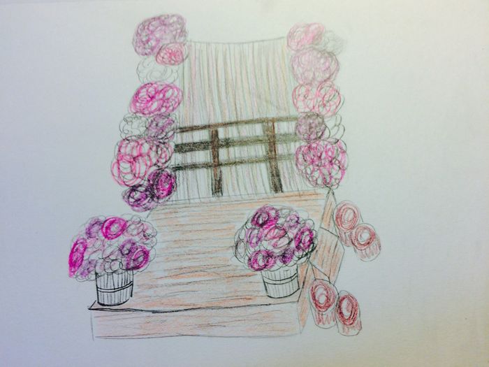 This is my ceremony location and we will be performing the ceremony on the stage. I have no idea what to do with the background or how I can hang things from this weird wood platform! I do have three large bushels of flowers that will be at the front...