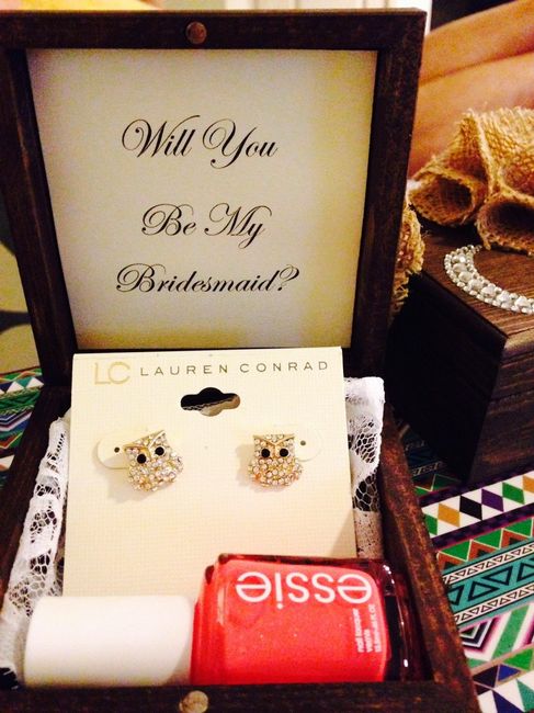 My fiance and I just set a date (5/14/2016). We have not asked any of our bridesmaids/groomsmen to participate in the wedding yet. I have been roaming Pinterest and seeing all kinds of cute ideas for "bridesmaid boxes". Did anybody do this? Looking...