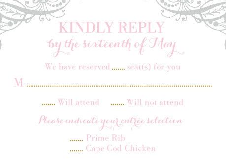 I am soo late on my invitations haha. I am ordering them tonight! How did you do your RSVP's? Did you put how many seats you reserved for your guests? I was thinking something along the lines of... Ex: We have reserved __ seats for you _ Accepts...