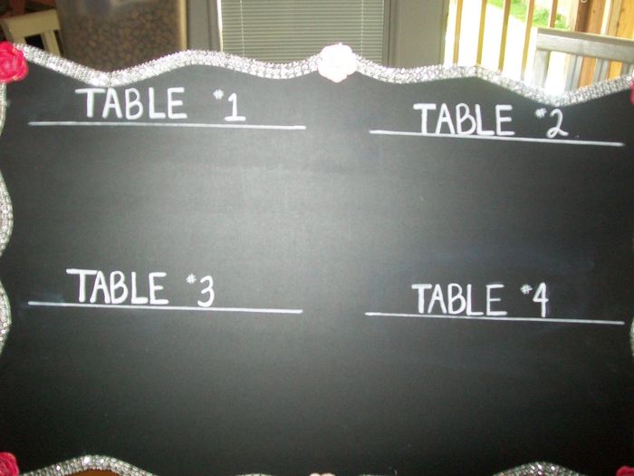 So, I decided to get crafty with the seating chart, instead of using individual cards with each guest name & table number, I made one board, pics attached. I am going to tie the little chalkboards around the vases that will be on each table.