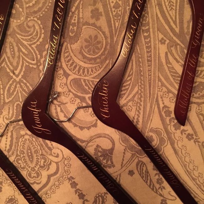Diy our hangers today pretty happy with how they came out. Only spent $2 to make them. My MOH is up higher because her dress has sleeves. Jus wish i would have done hers first so the titles were on the same side but it is what it. No one will notice...