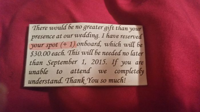 I meant to share a while back but forgot since I was wrapped up in wedding plans. Anyhow, we received a wedding invitation and in it was a small card (pictured) saying we need to pay $60. Lol even my FH knew that was ridiculous. He is the best man so...