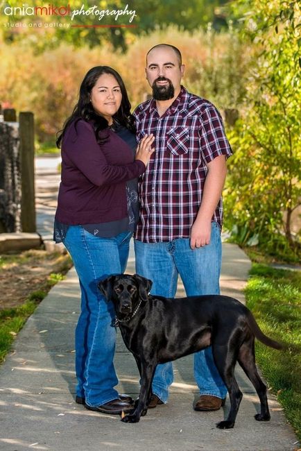We have decided against using our adorable puppy in the wedding. BUT we are still considering using him in the engagement photos. Share with me your engagement (or wedding) photo of you and your pets AND any tips you have!