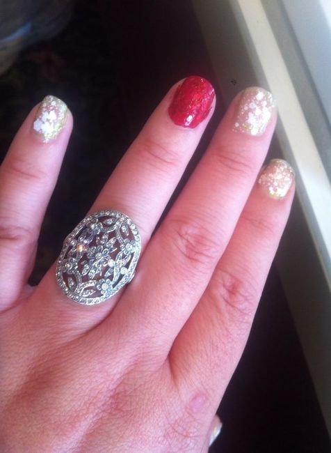 I got such a positive response to a picture I posted of my ring and some wanted to see a close up of it so they could see the details of it. So I thought I would post two pics minutes after he proposed. Pardon the bad paint job on my nails but had I...