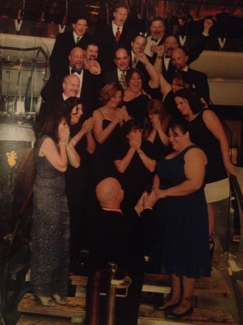 FH proposed to me while we were on a cruise with a bunch of friends. He arranged to propose when we were getting pictures taken, I was clueless. As he proposed the camera man snapped pictures which is awesome because it caught everyone's reactions....