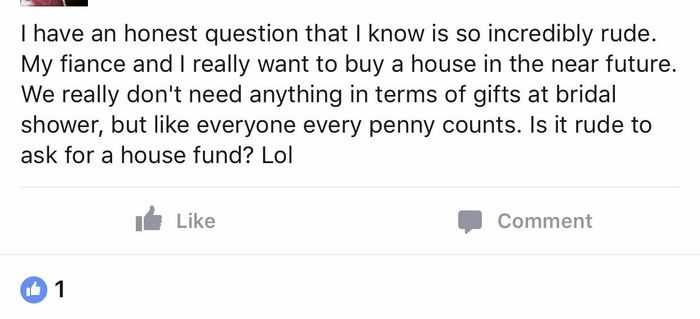 I am a member of a state wedding chat group on Facebook. Similar to WeddingWire discussion but localized. This was the WTF post today. The worst part is everyone commenting on the post is encouraging her to set up a house fund and that it "isn't rude...