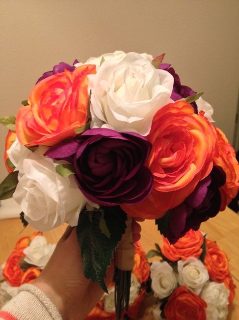 I put together bouquets for me and my 5 bridesmaids tonight and am pretty happy with how they turned out! All 6 bouquets for under $100! The girls are all going to be wearing plum dresses. Let me know what you guys think! I'm also open for any ideas...