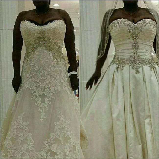 I'm stuck between this romantic lace and this almost royal satin dress. I love them both which one looks better to you