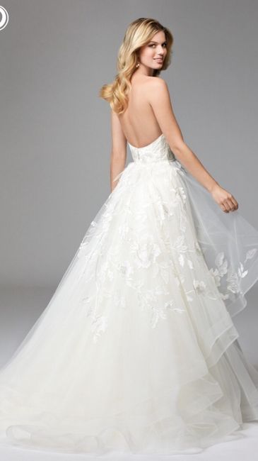 It has not come in yet. I can't decide if I want to wear a veil. I LOVE veils but I don't want it to take away from the applique detail on the back/train. My hair will be down and curly with a little bit swept up at the sides. Our wedding is outside...
