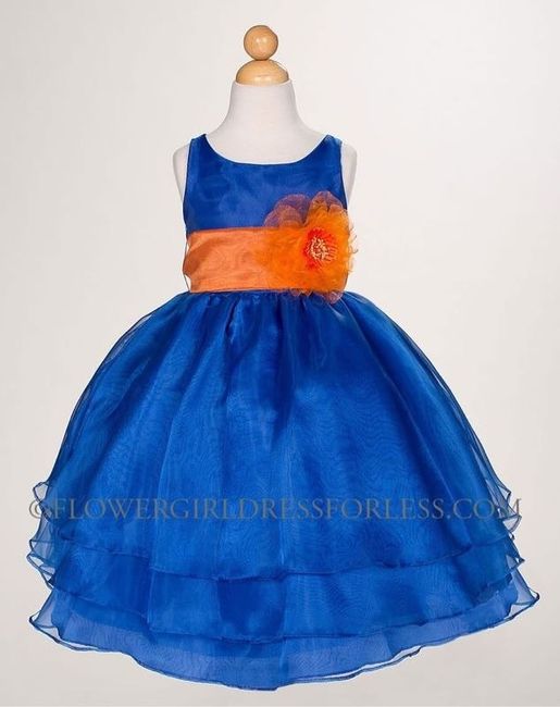 I know it's my own wedding and can do whatever but should a flower girl dress always be white?! I fell in love with this dress as soon as I saw it. But I'm wondering if it'll be too much. (My colors are blue and orange) the BM/ jrs will be in Royal...