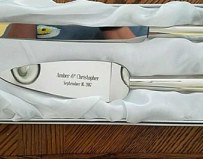 The butterflies in my stomach are doing cartwheels. It's getting so close now! One of our friends sent us an cake knife and server set with our names and date engraved on it. I told him he couldn't back out after that because we had engraved stuff...