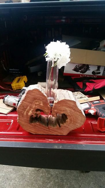 FH and I are playing around with our DIY centerpieces tonight. I'm thinking of adding jute string around the pillar candle and the actual flowers will be different, but it's a start! We've made everything so far collecting wood from our houses. Pics...