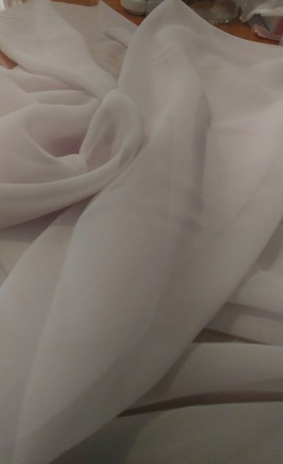 Hello Everyone!!! I started making my veil yesterday. I didnt want tulle, so I found a very light weight fabric. This is the what it looks like so far. Its a pale purple; my dress is a ivory strapless...I'm excited to see how it will turn out. ...