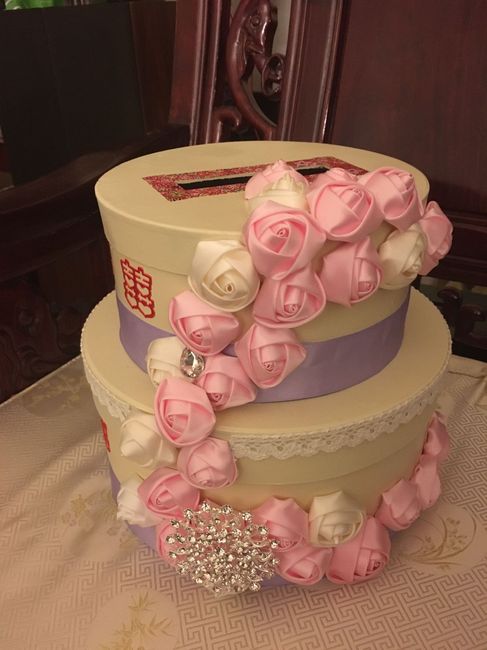 32 days to go until my wedding! I finally have my cardbox! Bought paper mache box from Joann (set of 3, I only used the small one & big one), cut out the opening to connect two boxes together, made a slit, and got to work Glue gun, spray paint...