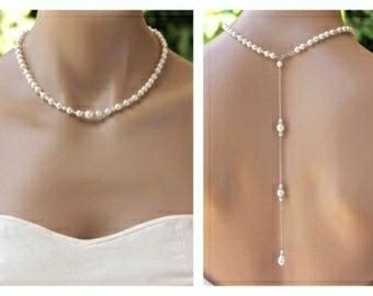 My dress is much more beautiful than the picture shows (thanks cell phone photo skills :/). I originally planned on wearing a pearl necklace, but I don't want to take away from the beading. There are pearl beads mixed in here and on the veil. What...