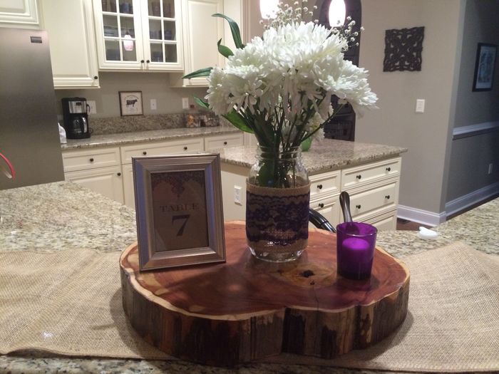 This is what I've got so far for my tables. (The slabs will not be this tall, and the flowers will be Oranges/Purples). White tablecloths with burlap runner, white chair covers with purple sashes. Thoughts? Ideas? Thanks!!