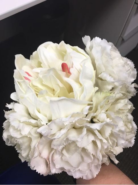 I'm working on making some true touch bouquets for my bridesmaids. I'm thinking of doing a peony in the center with carnations around it. I'm missing 2 carnations but what do y'all think so far?