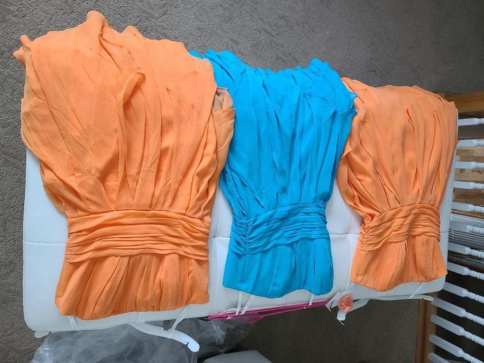 Hey ladies, I have 3 bridesmaid dresses available for sale. I had to postpone my wedding and totally changed my colors. They are a unique set of colors so I was hoping to get some interest on here. They are perfect for tropical weddings/ destination...