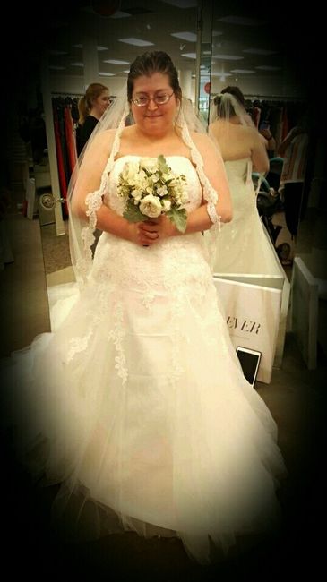 I just wanted to share!! I never thought I would try on this style-- but I'm so glad I did! The dress and matching veil will be ready in mid-March and ordered two sizes down which were my exact measurements. Woohoo!!! In my photo I was being sassy...
