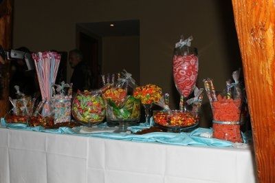 For favors, we are thinking about doing a candy "bar" with about 5 or 6 different candies for guests to choose from. We would have a table set up with bowls full of the candy, and have some organza drawstring bags for people to take some candy home...