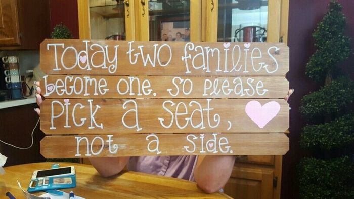 So I painted this sign for my friend's wedding. I really want to make a sign in the entrance so our guests will see it before the ceremony starts... but I don't know what I want it to say. Here is an idea I found online so far: "Pick a seat, either...