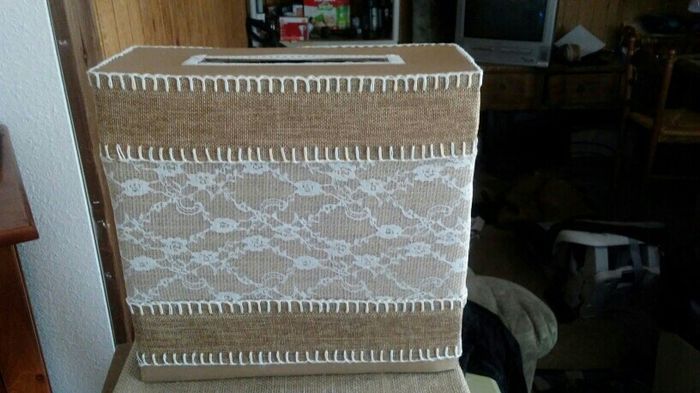I made my card box! We are going for a burlap/lace color scheme. I have been doing a ton of DIY projects to but costs. This is a repurposed laundry detergent box. Decorated with scrap fabric and ribbons. Totally free!