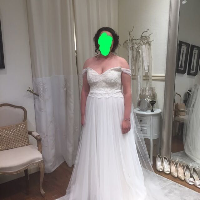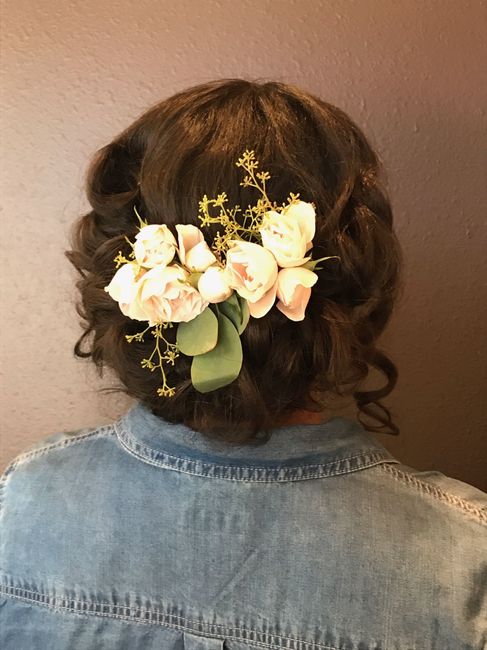 Hello! My dress isn't totally done, still lots of boning to go in so it doesn't look totally fitted. I got my hair and makeup trial done and tried on my dress. I've got ear jackets on and a sparkly bracelet that match. Also flowers in the back of my...