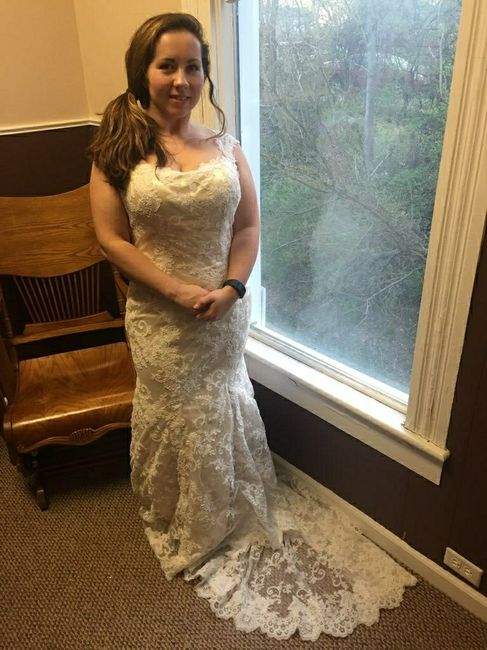 20 days out and I got my dress back! It's perfect, I'd just like to lose 5 or so lbs (I've been eating sooo bad lately) for a little more wiggle room. The lighting sucks, but it's still gorgeous! Anyone on the fence about a LaceMarry dress, do it! ...