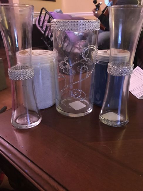 My FW and I have doing a sand ceremony at our wedding and I decided it would be fun to buy some glass containers and decorate them myself rather than buy a sand ceremony kit. I didn't really go as planned, my hands are covered in gorilla glue, the...
