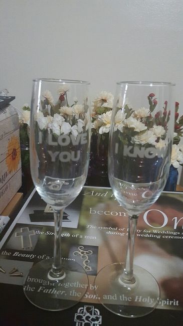 We scoped etsy up and down and FH and I couldn't agree on a design so we decided to put our monogram on our glasses. Luckily we found an etsy dealer willing to do it so here it is. I am considering adding our favorite scripture to the opposite side...
