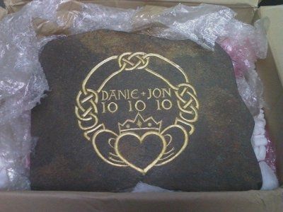 Danie got called in to work today, and found a huge package in her work station. it was our wedding plaque!!! I go to work later today and will have to wait, but can't wait to see it. many thanks to our stone carver, martin hachler...