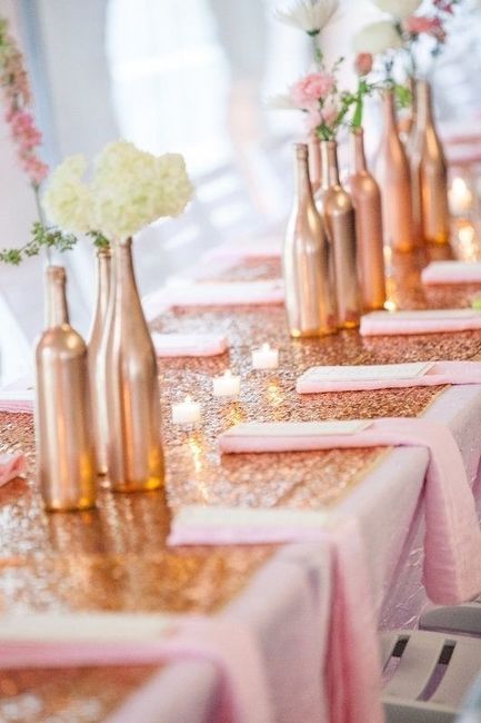 Hi so I'm planning my best friend's bridal shower. I'm trying to come up with a cute centerpiece. We have rose gold runners I bought these gold plates and I was thinking of putting bottles that are spray-painted gold rose gold maybe silver. Cute? Or...