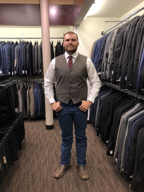 So, my dad and my brother are walking me down the aisle. My brother is a groomsmen as well. What should I have my dad wear? A vest like the groomsmen or just a wine colored button up shirt? picture of the groomsmen attire