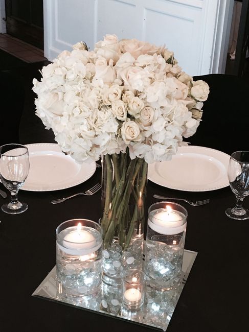 Went to finalize our centerpieces today. My theme is romance and elegance. All white w candles everywhere. There are candles behind as well. These were mock tables. Flowers are from grocery store, so they will be even more beautiful on day of from...
