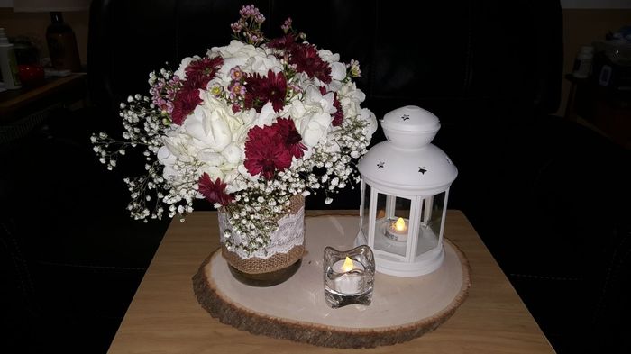 So far I have a mason jar, lantern, and wooden slab. Any suggestions to make it a little better? Flowers will go in mason jars.