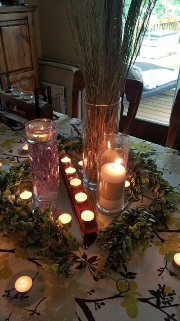 I just made some DIY centerpieces and I'm really happy with the way they turned out! It's a little hard to see the colors, but there's sage prairie grass in the tallest vase, lavender in the middle sized vase floating in water with a floating candle,...