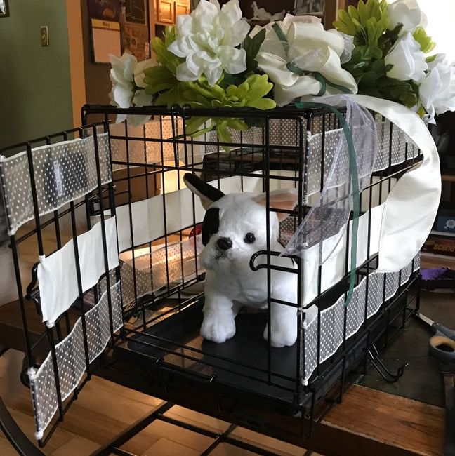 I mentioned in a post a LONG time ago that I planned to use a dog crate as our card box. Here's the finished product (haven't decided if the stuffed dog should stay or not ) Had a surprise bridal shower yesterday, and decided to incorporate the...